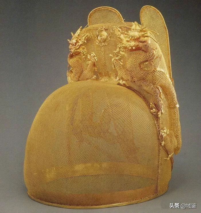 冠通高24厘米,后山高22厘米,冠口径20.5厘米,重826克。金冠全部用细如游丝的金丝编织而成,由前屋、后山、角(俗称纱帽翅)三部分组成。
