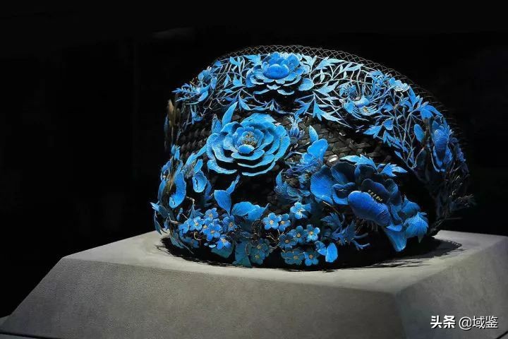 这赏心悦目的蓝,如陈丹青说的那种「猛蓝」既视感。这件钿子用不同的青蓝色拼出了花纹,翠羽黏贴的异常整齐,在点翠首饰中算得上非常难得了。不过点翠工艺独特的蓝色来自于翠鸟身上的羽毛,是一种以牺牲生命的美好来满足人类欲望的产物。呼吁大家拒绝买卖动物制品!