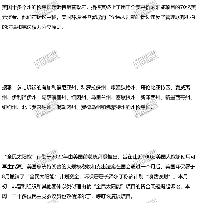 美国十多个州的检察长起诉特朗普政府,指控其终止了用于全美平价太阳能项目的70亿美元资金