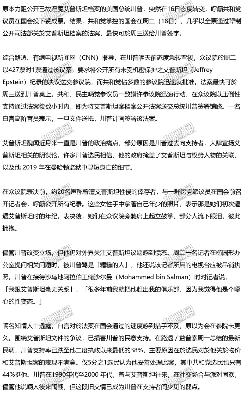 美国会压倒性票数通过!公开"淫魔富商"艾普斯坦档案 |