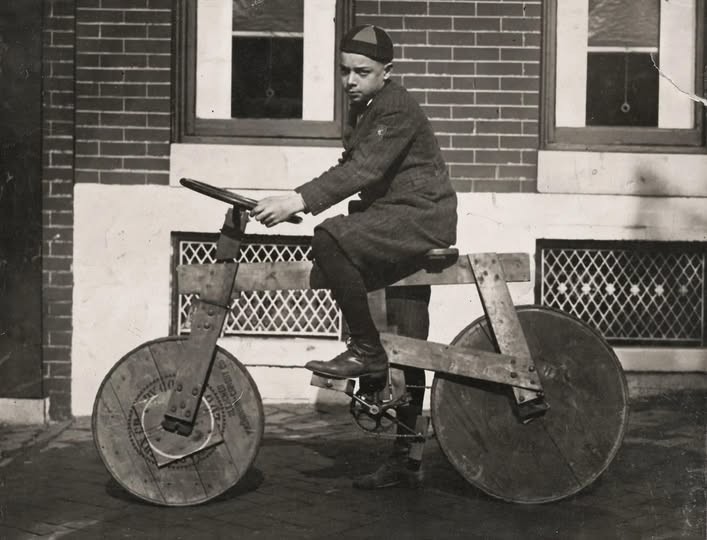 一个孩子骑着一辆自制的木制自行车。