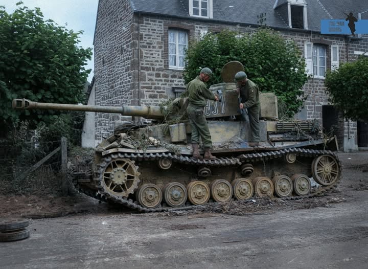 1944年7月,一辆德军四号坦克瘫倒在Saint Denis le Gast的街道上