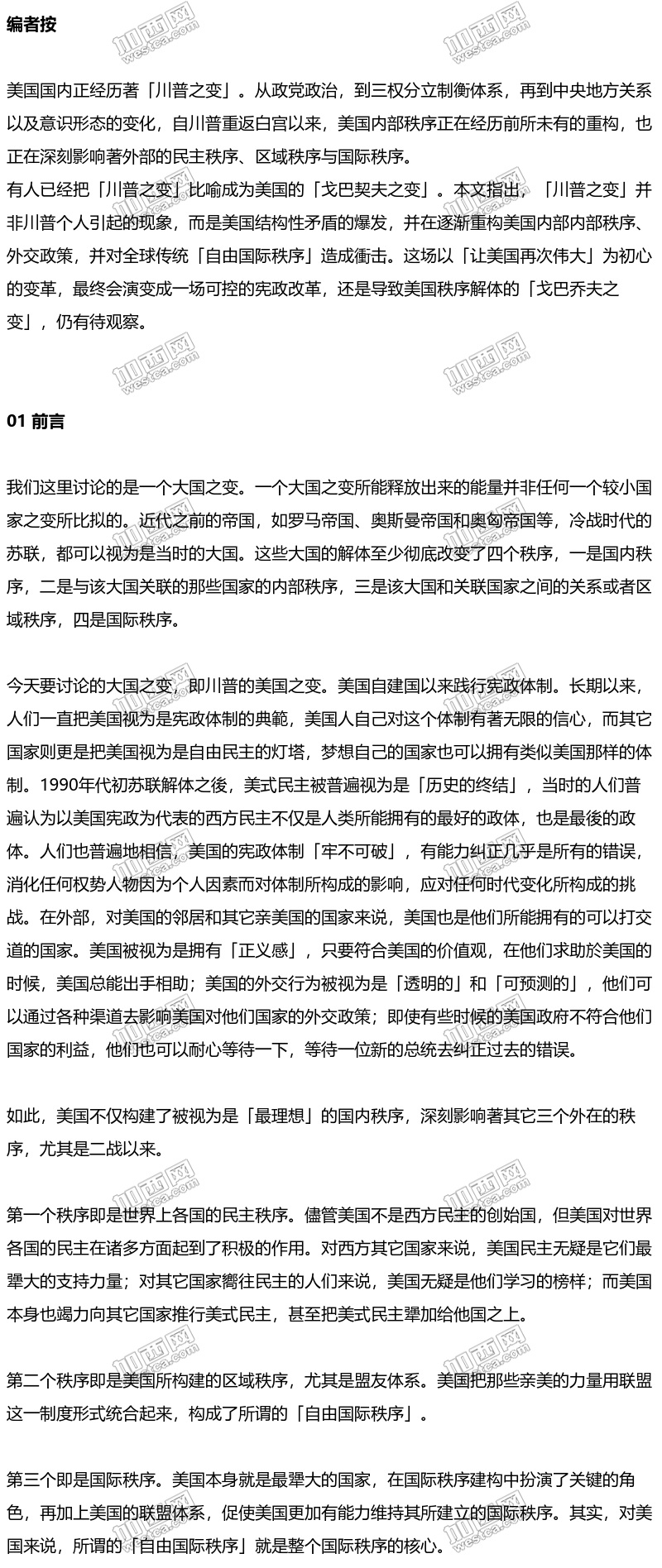 正如前面所分析的,二战以後,美国在推行和扩展美式民主过程中扮演了主要角色。无论是美国内部的民主问题,还是美国减少对其它国家民主政治的投入,都会深刻影响这些国家民主的发展进程,甚至是生死存亡问题。儘管如哈佛大学教授亨廷顿(Samuel P. Huntington)在其《第三波:二十世纪後期的民主化浪潮》(The Third Wave: Democratization in the Late Twentieth Century )中所指出的,历史上民主有进有退,但今天民主的「退潮」势头之犟是历史上不曾发生过的。无论对哪个区域或者哪个国家,川普对美式民主的输出已经不感兴趣。川普已经取消了专门从事输出民主的部门,即国际发展署。