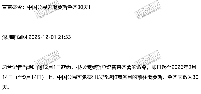 普京签令:中国公民去俄罗斯免签! 普京签令:中国公民去俄罗斯免签! 普京签令:中国公民去俄罗斯免签!