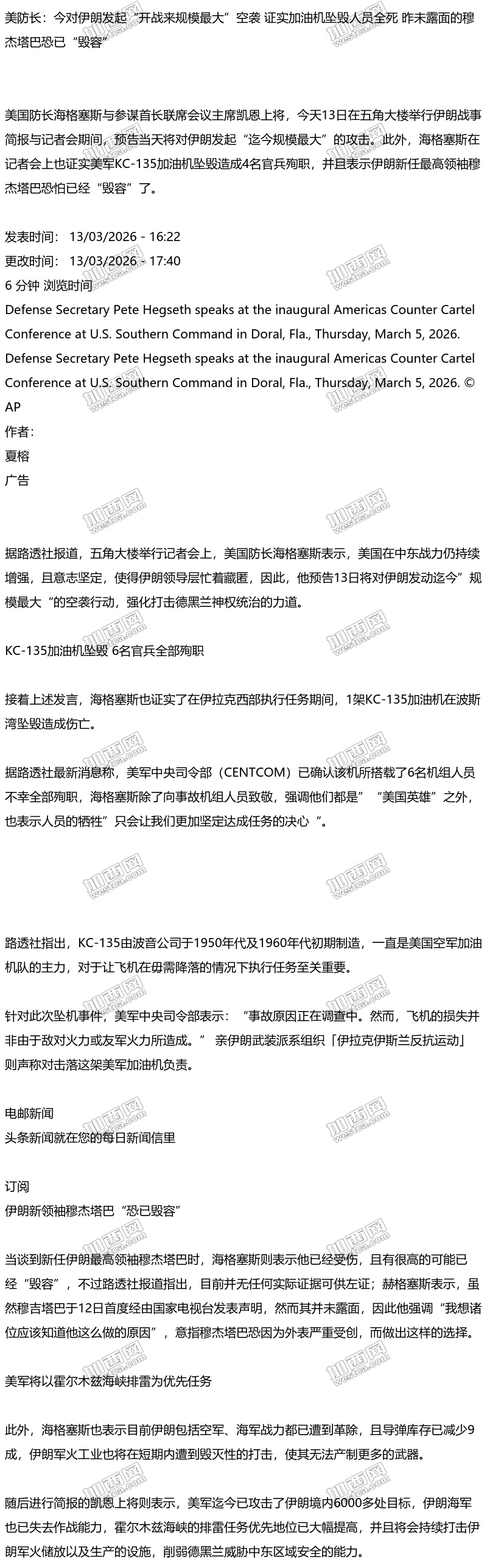 溫東小兵和老狼哭死! 美防長:今對伊朗發起“開戰來規模最大”空襲 證實加油機墜毀人員全死 昨未露面的穆傑塔巴恐已“毀容”