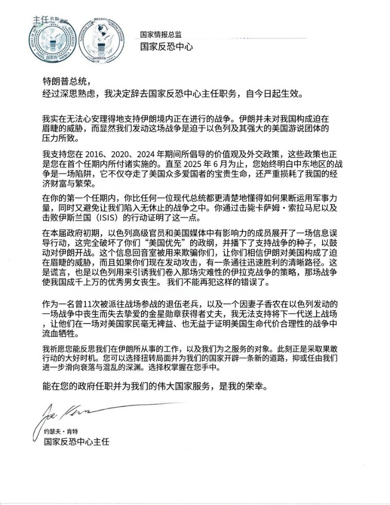 美反恐高官因美以伊戰爭辭職 背後有哪些隱情?