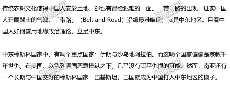 从表面上来看,巴基斯坦驻军沙乌地阿拉伯是为了防禦伊朗,事实上不然;只要有点大脑就可看出,巴基斯坦根本就是中国打进中东地区的一个楔子,其实是为战後的沙伊和解、以及中东格局奠定基础。