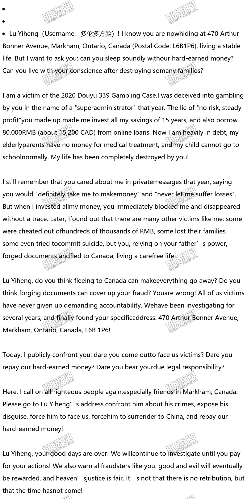 > [Confront Lu Yiheng! Can You Sleep Soundly in Canada? Victims of Douyu 339 Gambling Case Demand Accountability C Address