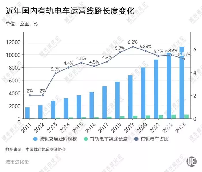 根据协会官网公布的2011年至2023年城轨交通统计数据,2011年,国内(不含港澳台,下同)开通有轨电车线路运营总里程只有41公里,属于刚刚萌芽的阶段,在全国所有城市轨道交通总里程中占比仅2%。