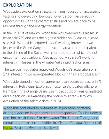 报道称,伍德赛德在官网公开的2023年年度报告显示,该公司在优化勘探投资组合的过程中剔除了包括韩国在内的三个项目,理由是认为其“不再有潜力”(no longer considered prospective)。《韩民族日报》认为,这可以解释为伍德赛德判断其没有事业发展可能性,所以选择了离开。