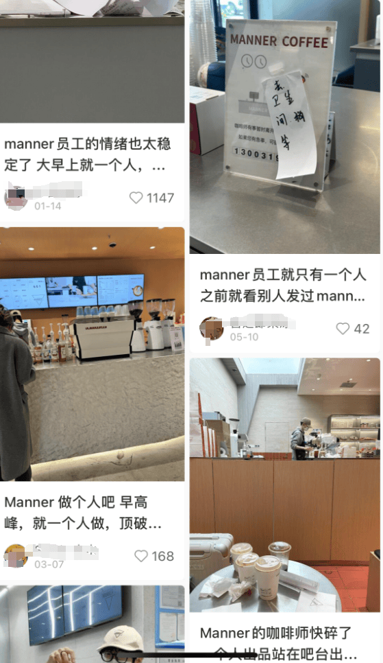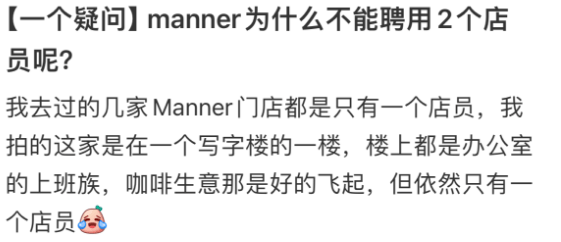 在社交网站上随便一搜,会发现很多人都曾吐槽Manner“一家店只配一个店员”是常态。