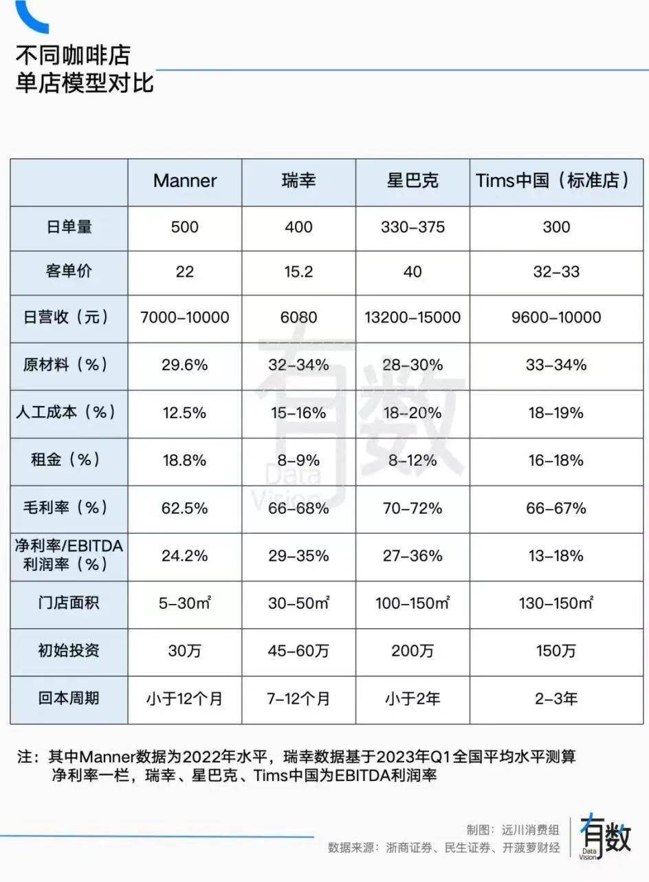 根据2022年的数据,Manner的人工成本仅占12.5%,小于瑞幸、星巴克和Tims。