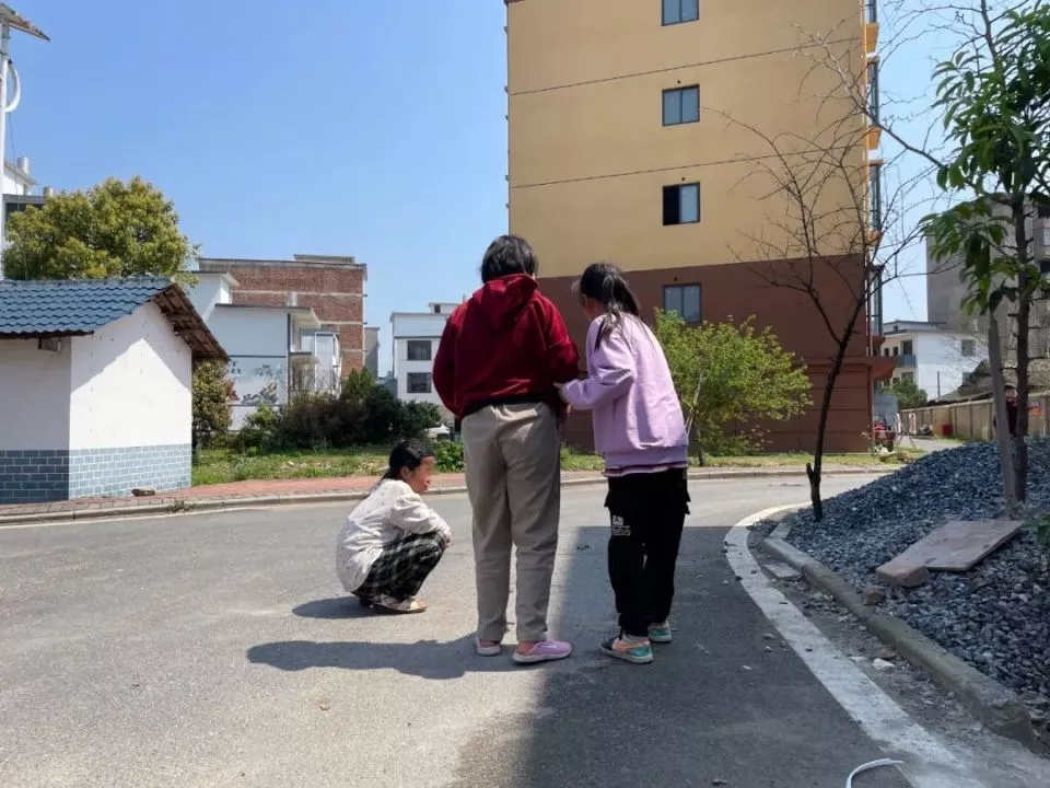 夏夏(中),星星(左),小妹一起玩跳房子的游戏