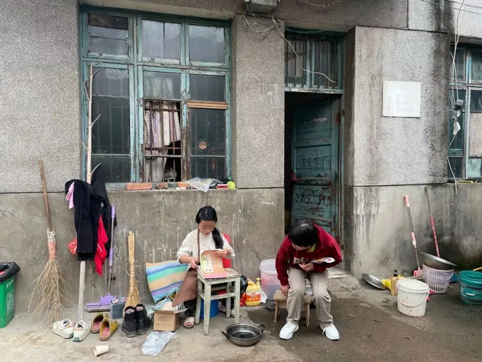 星星家门口,夏夏和她唯一的朋友星星,星星在练字