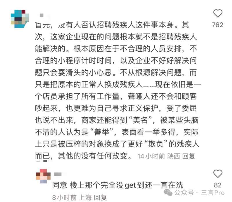 还有网友表示,没有人否认招聘残疾人这件事本身。但现在依旧是一个店员承担了所有工作量,聋哑人还不会和顾客吵起来,也更难为自己寻求正义保护,受了委屈也说不出来,商家还能得到“美名”,被某些人认为是“善举”,表面看一举多得,实际上只是被压榨的对象换成了更好“欺负”的残疾人而已,其他的没有任何改变。