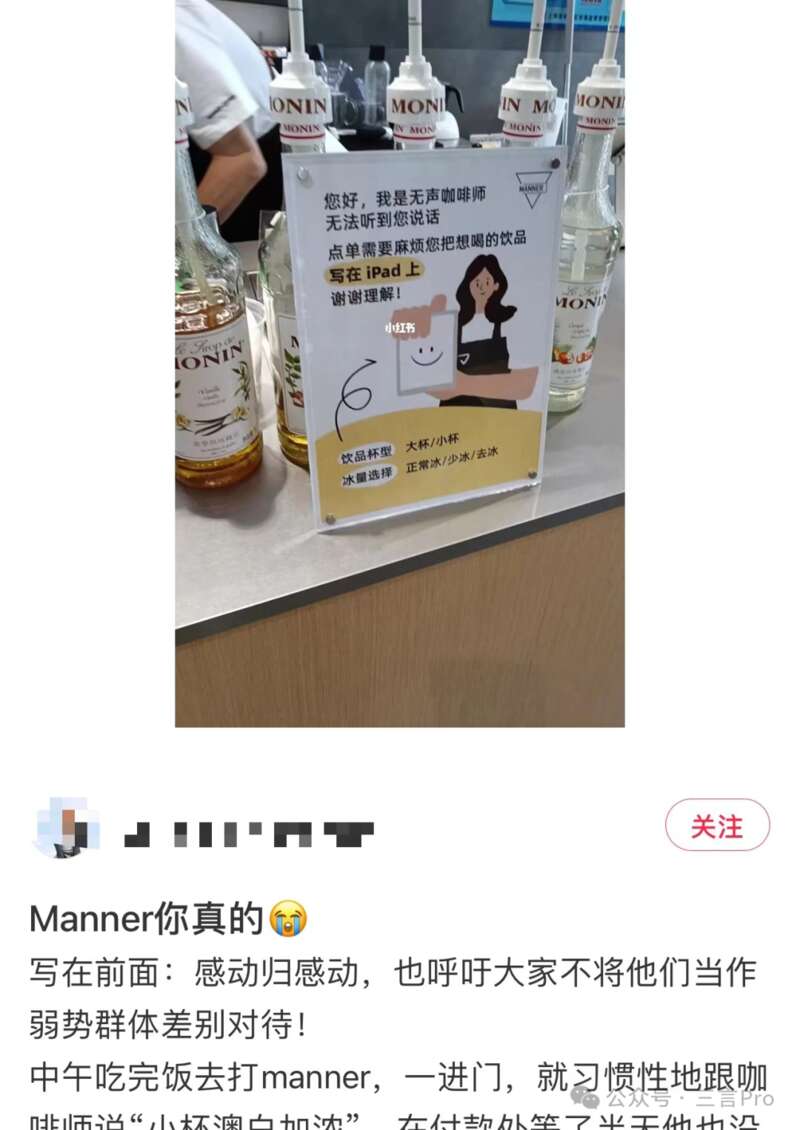有网友称,自己去Manner,一进门就习惯性地跟咖啡师说“小杯澳白加浓”,在付款处等了半天他也过来点单。后来才发现有提示牌提示,咖啡师是聋哑人。