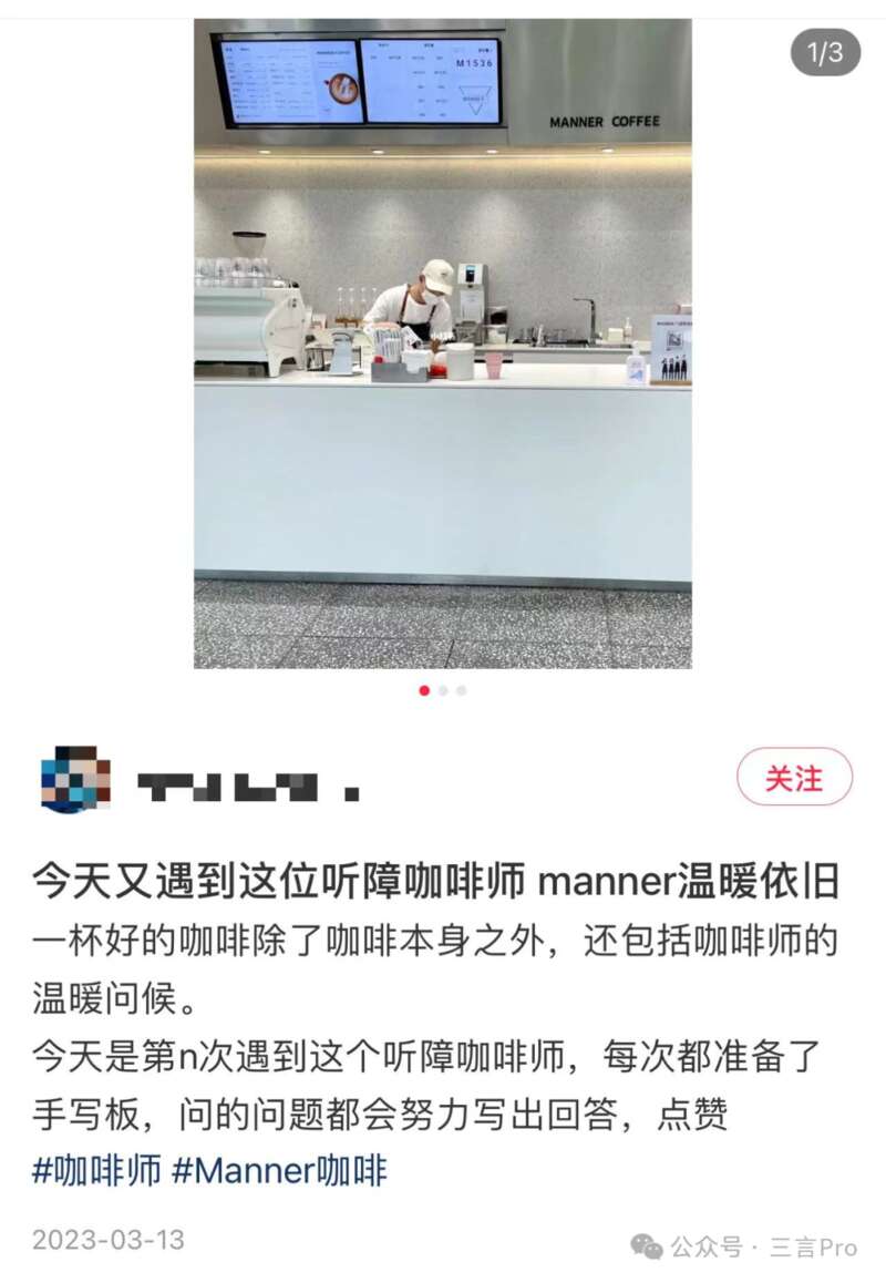 三言咨询了今天发帖说Manner换聋哑人的网友,对方表示,店里只有一个咖啡师。