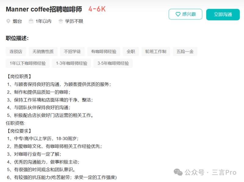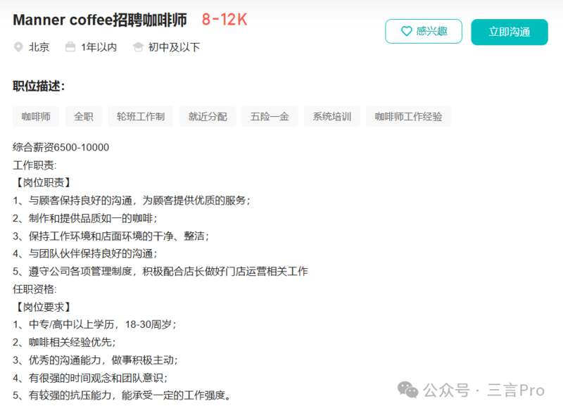 而Manner咖啡公众号里写的咖啡师是8000+。