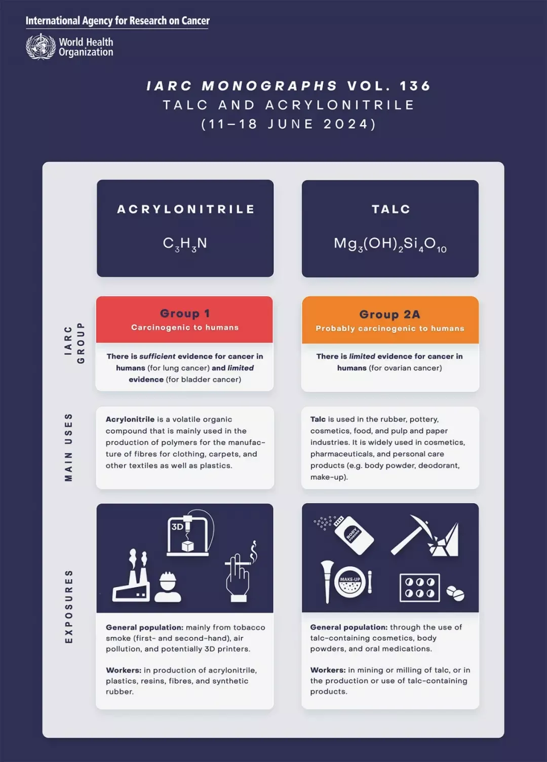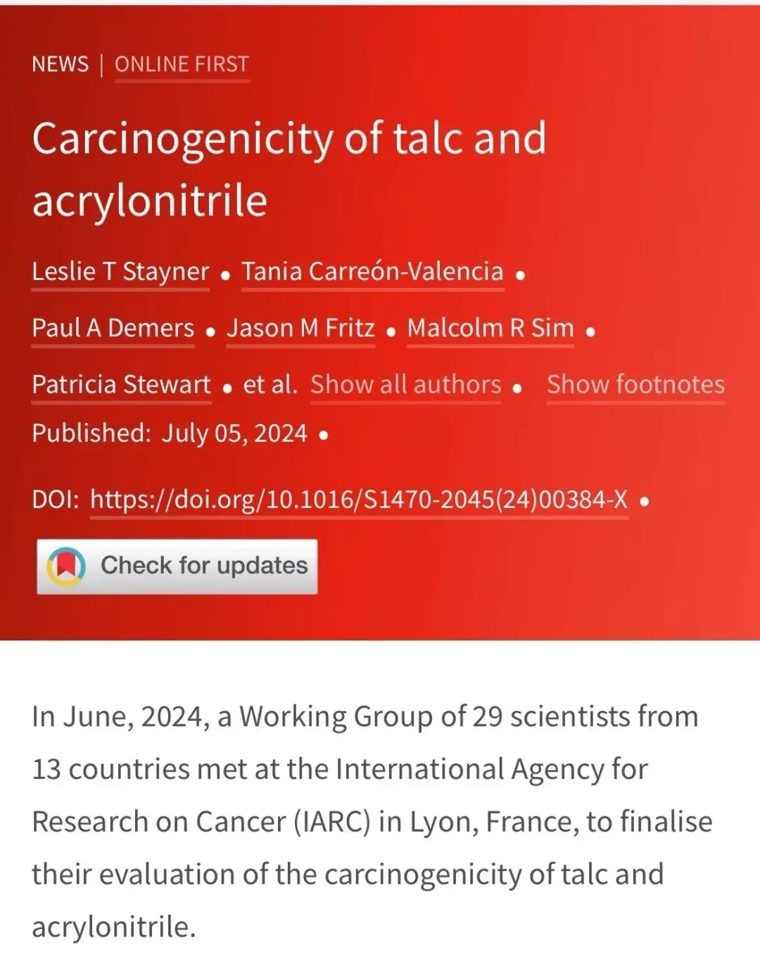7月5日,世卫组织国际癌症研究机构(IARC)发表公告:来自13个国家的29名科学家组成的工作组,在法国里昂国际癌症研究机构(IARC)举行会议,在彻底审查了现有的科学文献后,IARC宣布将滑石粉归类为2A类致癌物。