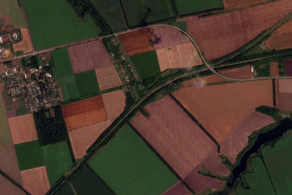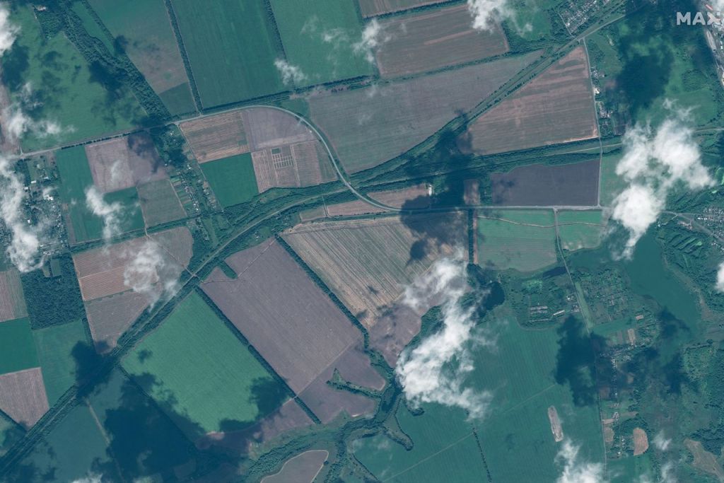 7月底和8月中旬的卫星图像显示了俄罗斯库尔斯克地区挖掘防御壕沟前后的景象。