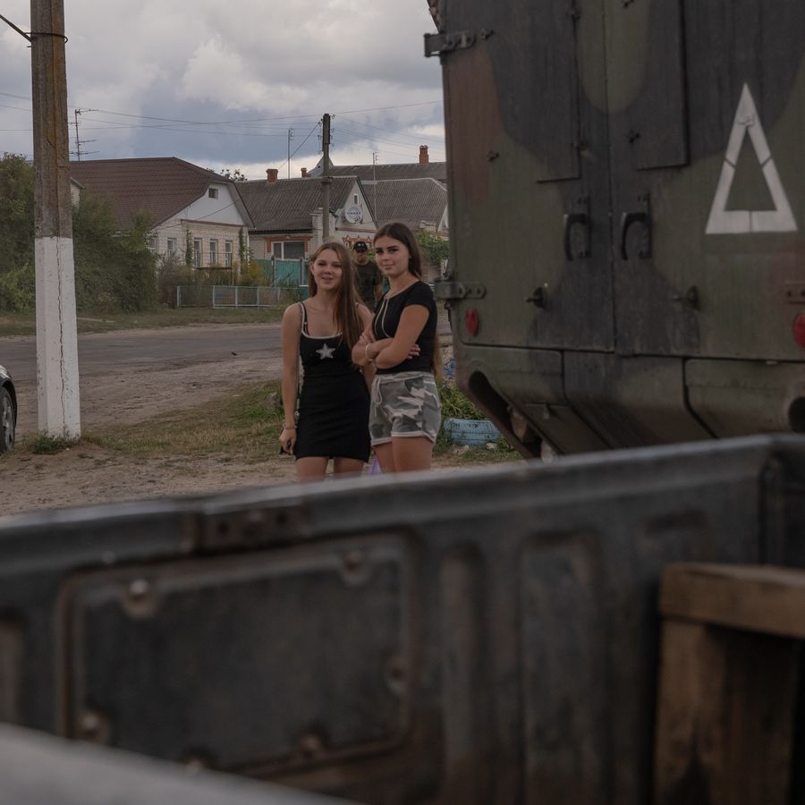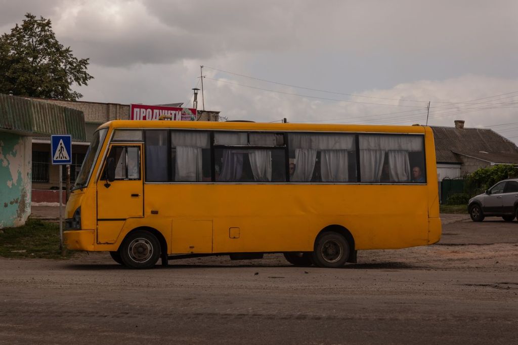 在向俄罗斯领土发动进攻期间,一辆载有乌克兰平民的巴士。一个村庄的两位村民看着军车纵队行进。