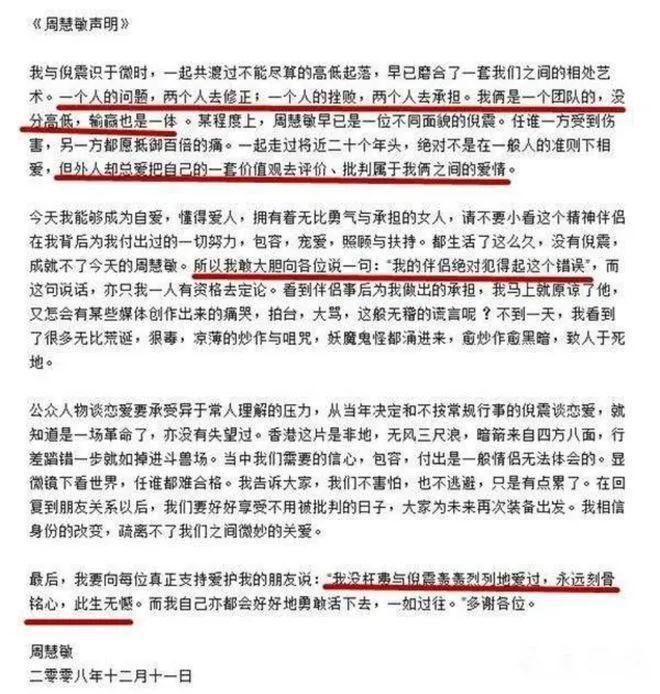 这一次,倪震终于良心发现,觉得是自己理亏,在同一天发表声明主动与周慧敏分手。