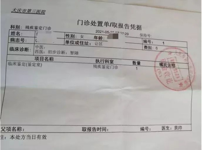 王先生介紹,2021年,社區工作人員告知外甥女的殘疾證到期,要辦理新證,需要去大慶市第三醫院重新評審。他提供給澎湃新聞的門診處置單顯示,2021年5月28日,外甥女在殘疾鑒定門診進行臨床鑒定,初步診斷結果為“智障”。
