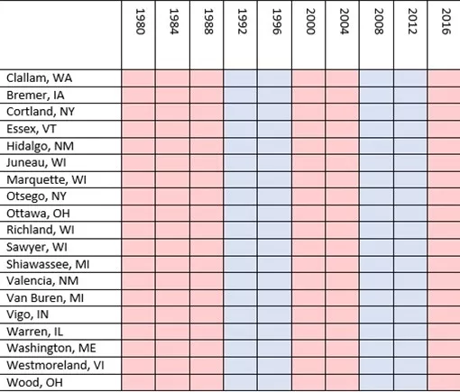 所谓风向标县,就是在历史上准确预测大选结果的地方。这些地方分布在全美各个地方(很多在摇摆州),人口一般数万人,选民画像是美国人口结构的某种缩影。由于美国大选历史很长,不同时期政治差异很大,所以约定俗成就选在1980年——看看这个地方自1980年以来预测大选的准确度。