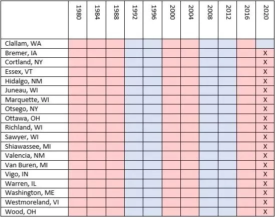 不过2020年川普和拜登大选的情况完全不同:19个“风向标县”里有十八“阵亡”(参见下图):