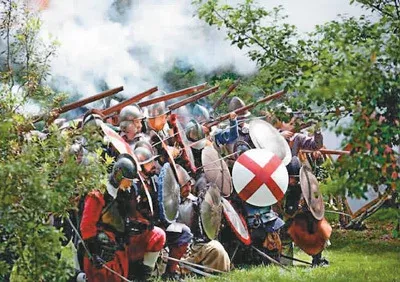 2007年5月11日,在美国弗吉尼亚州詹姆斯敦殖民定居点旧址,一些全副武装的演员正在重现当年殖民者士兵与印第安人战斗的场景。 新华社