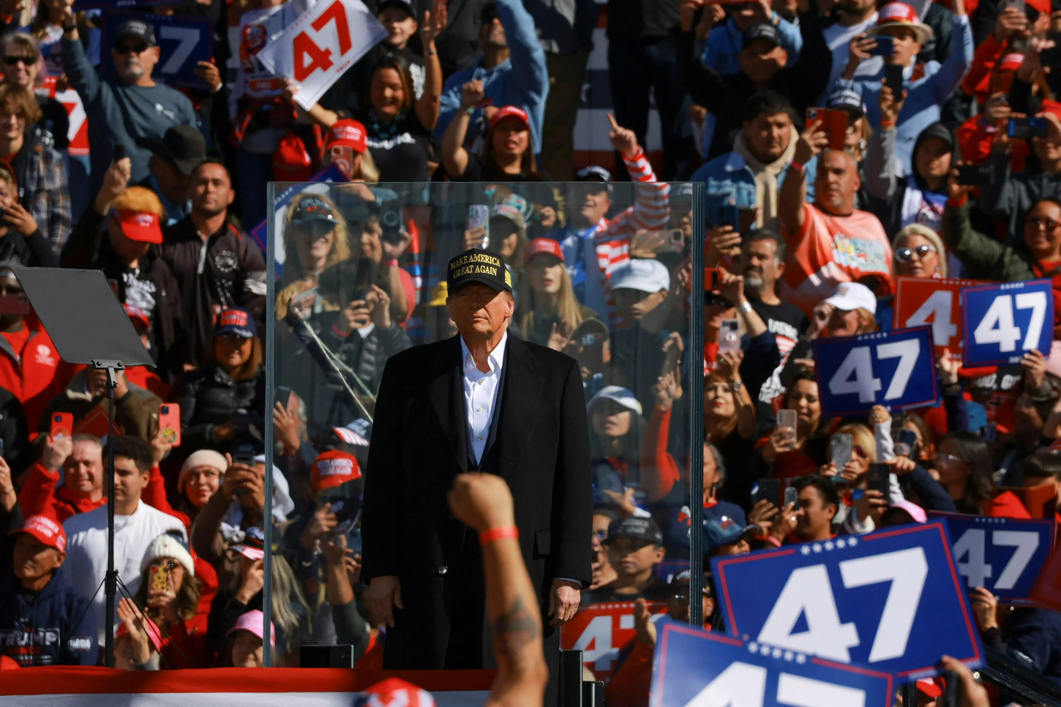 图为2024年10月31日,美国共和党总统候选人、前总统川普(Donald Trump)于新墨西哥州举行集会。(Reuters)