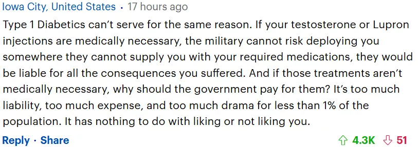 有人写道:1 型糖尿病患者不能服役也是出于同样的原因。如果您注射的睾酮或 Lupron 是医疗必需的,军方就不能冒险将您部署到他们无法为您提供所需药物的地方,否则他们将对您遭受的一切后果负责。如果这些治疗在医学上不是必需的,为什么要由政府买单?对于不到 1%的人来说,这责任太大,花费太多,也太戏剧化了。这与喜欢或不喜欢你无关。(他的留言获得了4300的点赞)