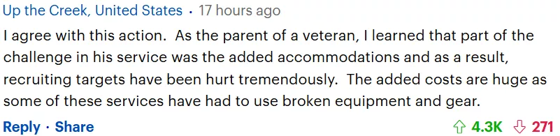 有人写道:我同意这一行动。?作为一名退伍军人的家长,我了解到他服役过程中面临的部分挑战是增加住宿,因此,招募目标受到了巨大伤害。?增加的成本是巨大的,因为其中一些部门不得不使用破损的设备和装备。?(他的留言获得了4300的点赞)