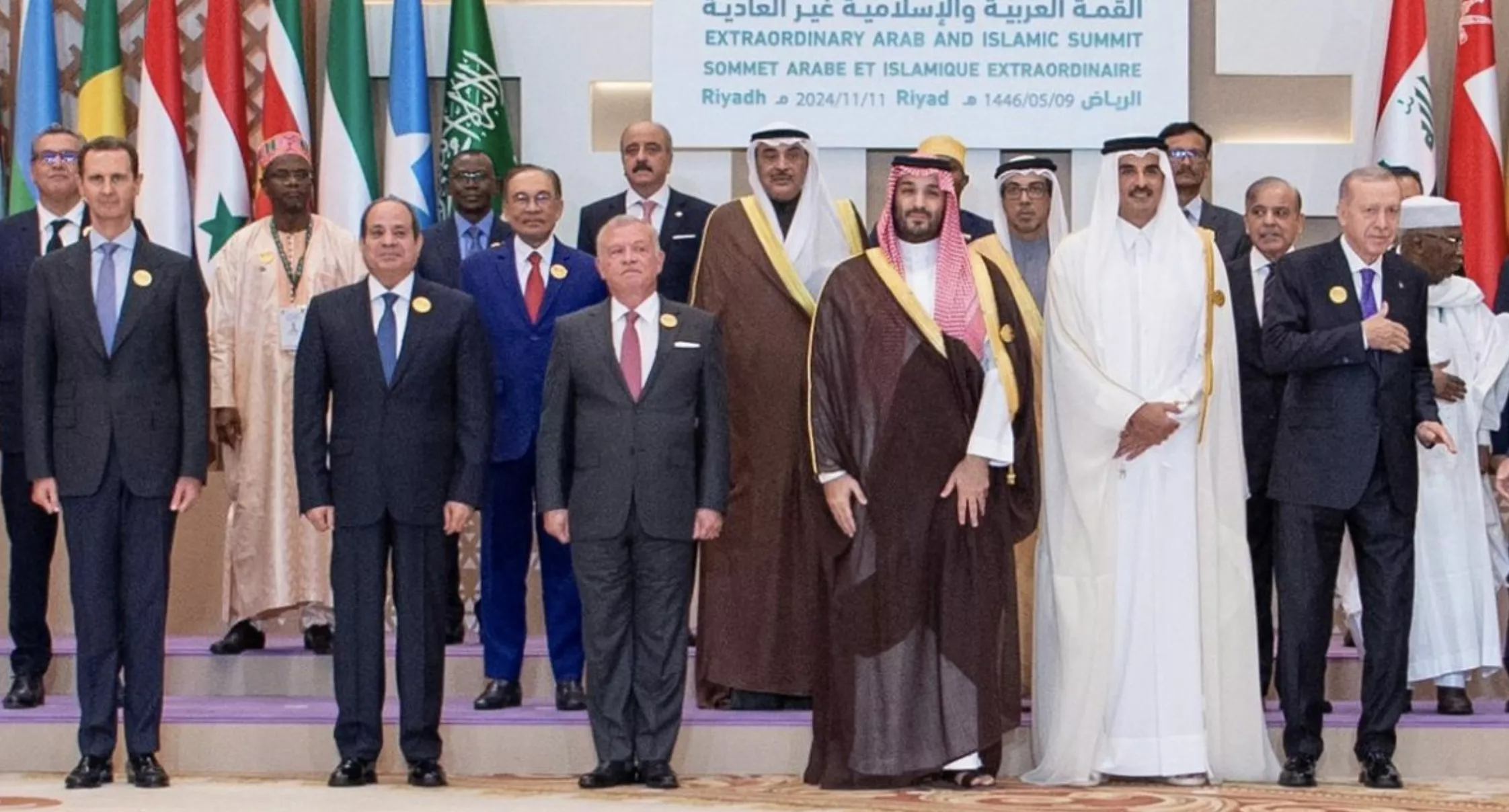 11月11日,在利雅德舉行的非常規阿拉伯和伊斯蘭峰會上,出現敘利亞總統阿薩德(左一)同土耳其埃爾多安(右一)同框的罕見場面。(沙特外交部網站截圖)