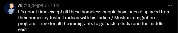 “特鲁多大批放入印度/穆斯林移民难民,是时候把这些人送回去了!他们把加拿大人挤到了街上。”