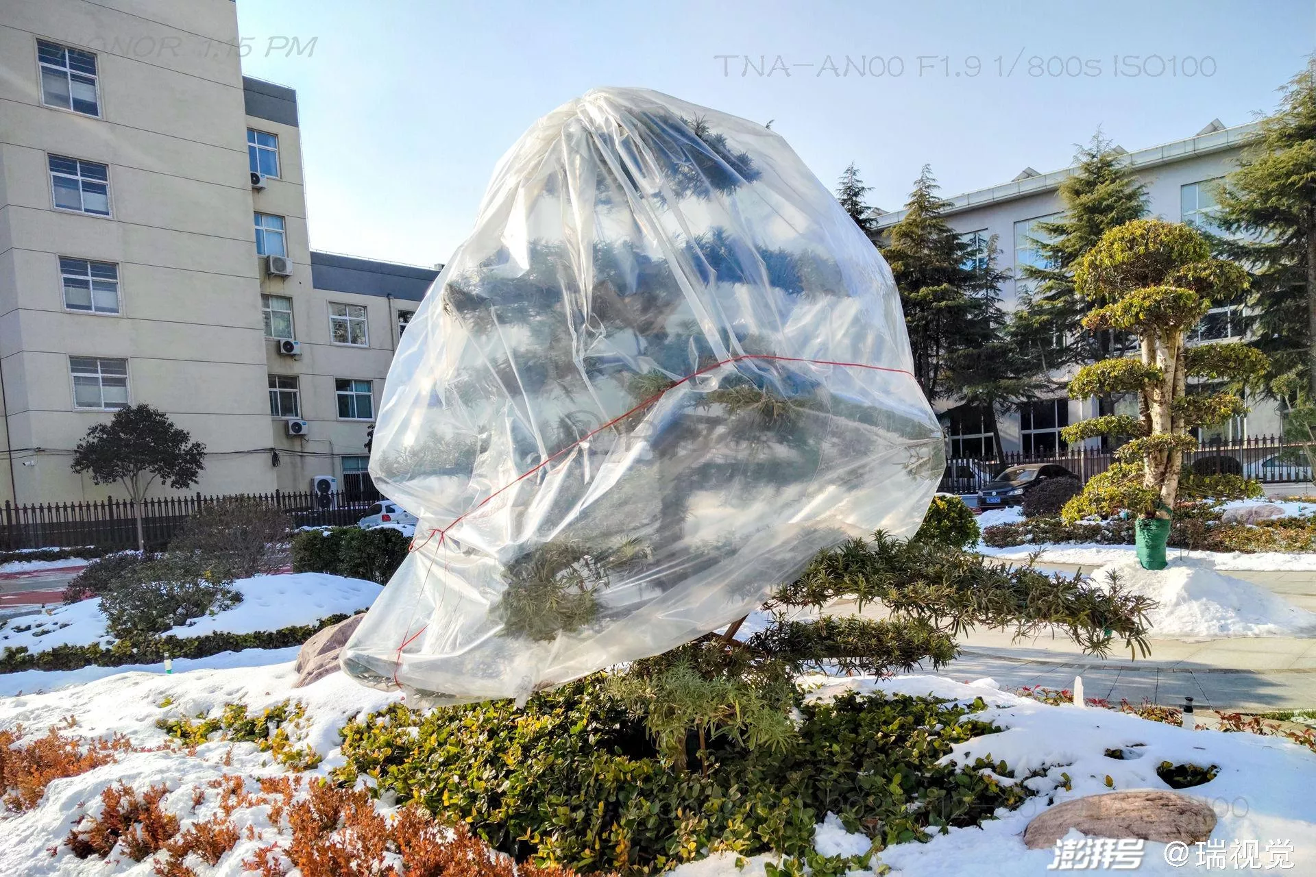 园林苗木的管护工人,给这些苗木套上了可以保暖的塑料袋。