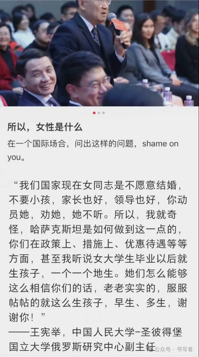 哈薩克斯坦國務顧在中國人民大學演講,人民大學不知道是教授還是個啥,叫王憲舉的提問說,自己到哈薩克斯坦看見到處都是小孩,而中國正面臨生育率低的問題。“我們國家現在女同志是不願意結婚,不要小孩,家長也好,領導也好,你動員她,勸她,她不聽。”他問了對方一個令人無比震驚的問題: