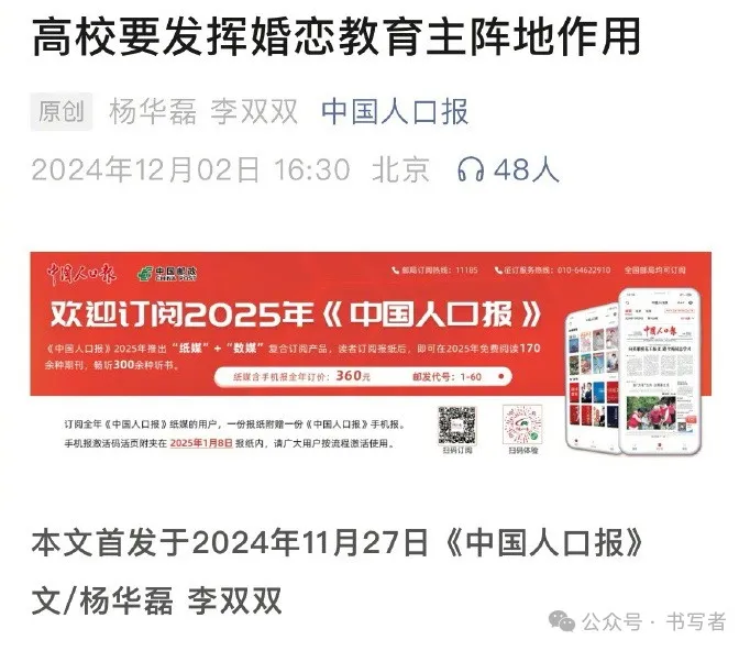 前不久,《中國人口報》發表《高校要發揮婚戀教育主陣地作用》,作者是中南財經政法大學的楊華磊、李雙雙。