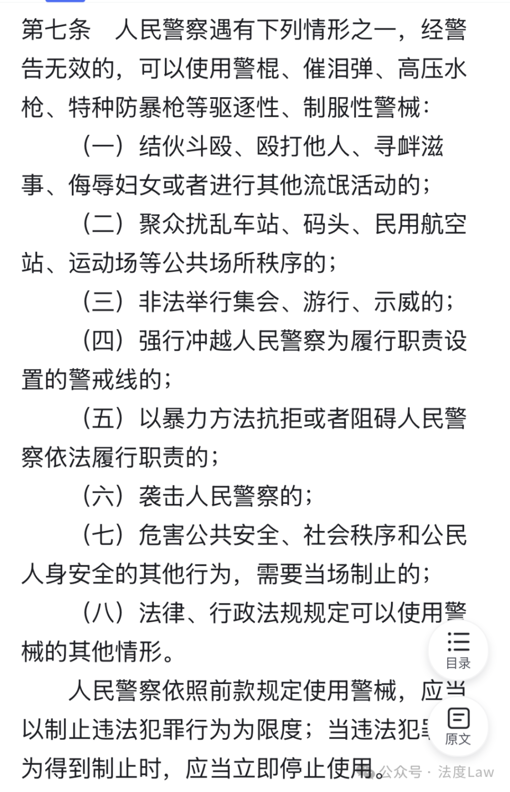 《人民警察使用警械和武器条例》第7条规定了使用警械的情形,这起事件发生时不存在其中任何一种情形,并且上述警械的使用以警告为前置程序。