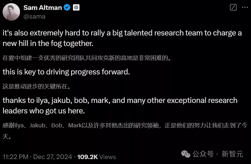 与此同时,奥特曼发文点名OpenAI研究员(大部分已经离职),表示感谢。