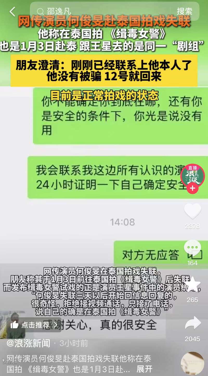 此外又有消息曝出,演员何俊旻又失联了?根据浪涨新闻的消息,演员何俊旻朋友称其于1月3日前往泰国拍《缉毒女警》后失联。而发布缉毒女警试戏的正是演员王星事件中的演员统筹。