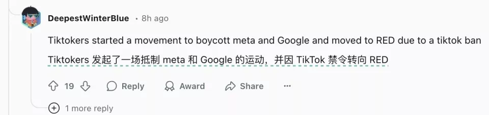 在Reddit上,有很多用户表示上周在Tiktok上就已经发展出了一场抵制Meta和Google,乃至美国政府对Tiktok封禁的运动。