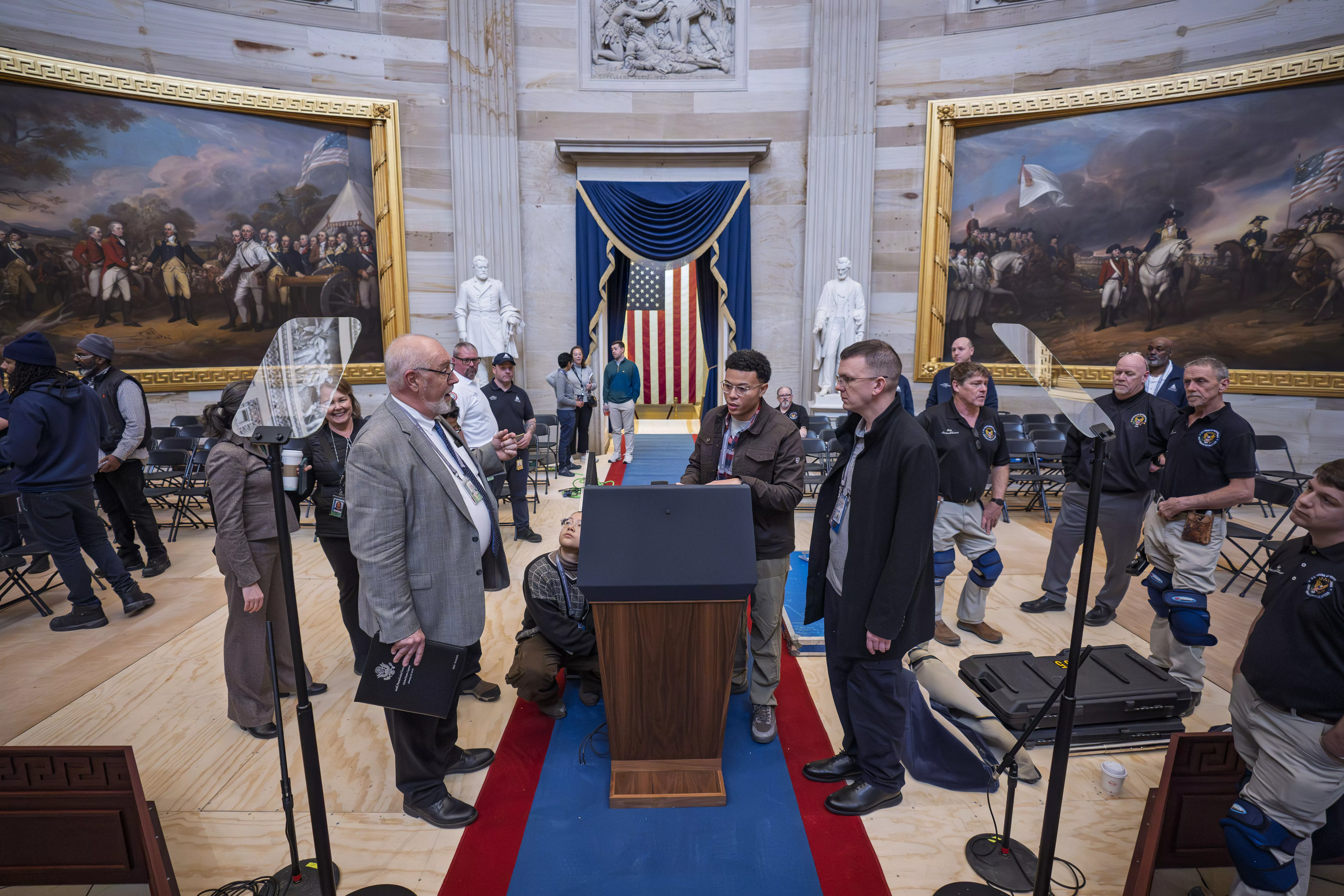 美国候任总统川普20日就职典礼临时改至国会山庄圆形大厅举行。工作人员加紧布置,大厅已排出折叠椅,美媒报导约可排600张椅子,目前一位难求,川普的金主也难拿到入场券,急电川普阵营帮忙。