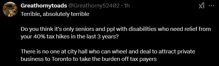 “太糟了,绝对太糟糕了!你以为只有老年人和残疾人才要减轻过去 3 年 40% 的加税吗?市政厅里就没有人能驾驭各种手段吸引私营企业来多伦多,减轻纳税人的负担吗?”