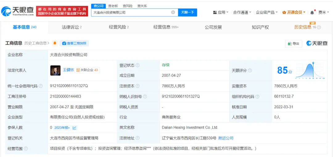 据天眼查,近日,由王健林、王思聪共同持股的大连合兴投资有限公司,新增一则股权冻结信息,被执行人为王健林,冻结股权数额7702.8万元人民币(专题),股权被执行的企业为该公司,冻结期限自2025年2月11日至2027年2月10日,执行法院为大连市西岗区人民法院。