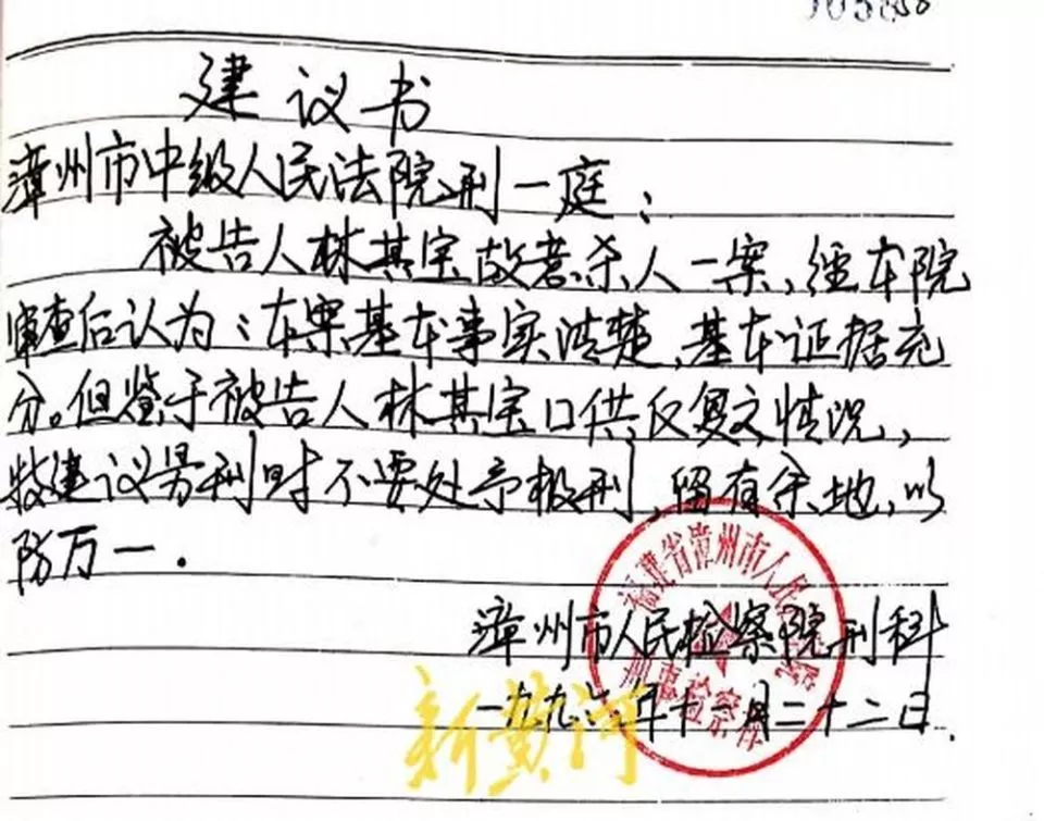 另外值得注意的是,在1996年11月,也就是在一审判决的前夕,漳州市人民检察院给漳州市中级人民法院写了一封建议书。该建议书称:“被告人林其保故意杀人一案经本院审查后认为基本事实清楚、基本证据充分,但鉴于被告人林其保口供反复之情况,特建议量刑时不要处予极刑,留有余地,以防万一。”