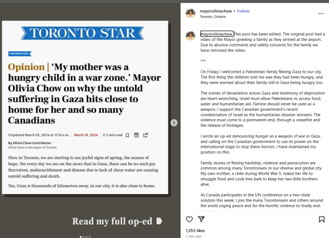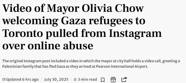 多伦多市长邹至蕙(Olivia Chow)表示,在她的社交媒体上发布了一段欢迎一个巴勒斯坦家庭抵达多伦多视频后,该家庭遭到一连串的网络暴力,她被迫删除了该视频