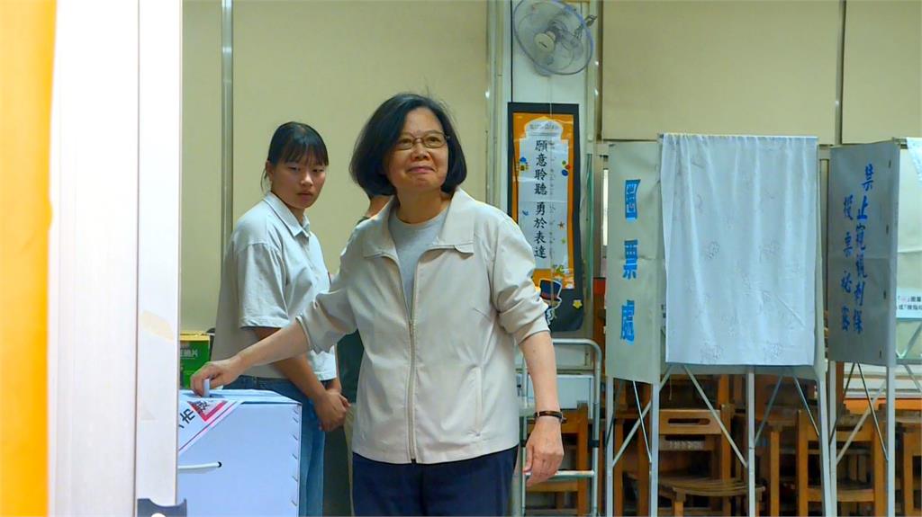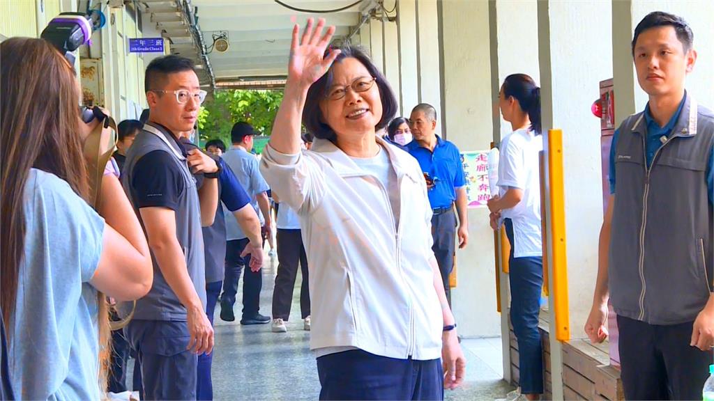 前总统蔡英文于下午1点10分左右来到建安小学,完成核三延役案的公投投票,身穿卡其色外套、顶着随兴蓬松短发的蔡英文,一派轻松的面带微笑将选票投入票匦,面对现场媒体,被问到“总统开心吗?”,蔡英文露出灿烂微笑、看向镜头没有特别说话,当她快步准备离开时,被记者要求“挥个手! 挥个手!”,蔡英文停下脚步转过身,似乎发现自己头发有点乱,她先是拨松自己的头发,再应记者要求挥手,有求必应的回馈,让现场顿时充满笑声。