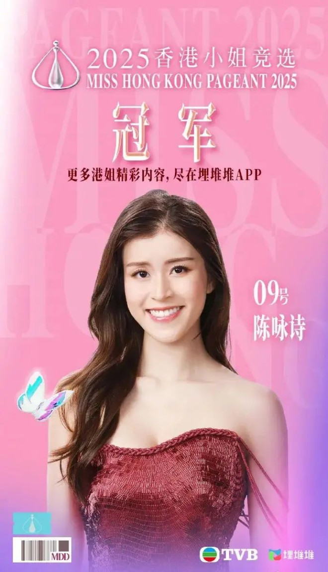 今晚2025香港小姐决赛举行,冠军由9号陈咏诗夺得,同时她也是首位拥有博士学历的港姐冠军。