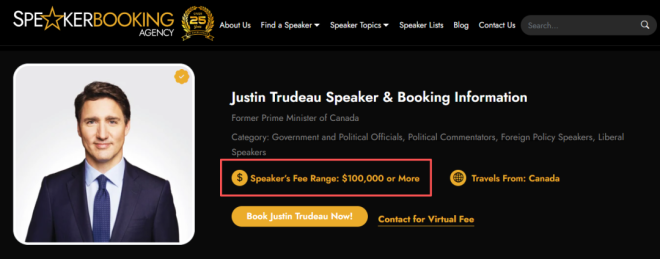 代理特魯多演講業務的演說家預訂機構(Speaker Booking Agency)介紹,特魯多現場演講的費用為$10萬美元或更高。